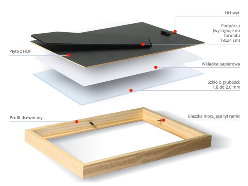Ramka drewniana DRI-G ma szkło, tył z HDF-u oraz uchwyty do wieszania (mniejsze formaty zawieszka nakładana na płytę HDF, większe mają nabite uchwyty na płycie). Każda z ramek może być eksponowana w pionie i w poziomie, do rozmiaru 18×24 posiadają podpórkę do postawienia. Ramki zabezpieczamy folią ochronną, dodatkowo w formatach od 21×30 stosujemy narożniki kartonowe.